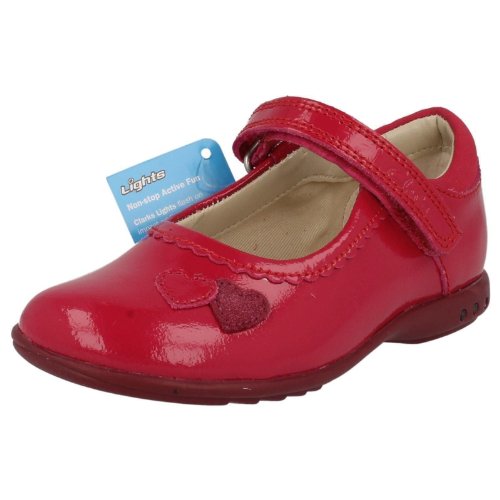 Girls Clarks Casual/Special Occasion Shoes Trixi Heart Pretty patent leather uppers Rounded toe Single velcro fastened strap for a more secure fit and easier adjustment Textile/Synthetic lining Other materials used for the soles Cushioned ankle collar Fun flashing lights in the soles as you walk Ideal for casual wear and special occasions Available in whole and half sizes ***Please note there is no on/off switch for the lights on these shoes and they have a limited life***