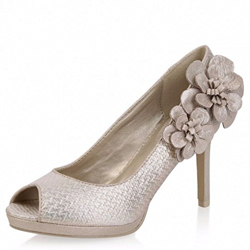 Ruby Shoo Donna women's court shoes are great for a smart occasion with a metallic gold textured fabric upper with a subtle zig zag pattern. The shimmering stiletto heel and peep toe combined with shimmering double flower corsage at the heel add a glamorous finish to these fashion court shoes. Ruby Shoo Donna gold shoes also have a low platform and rubber sole sole for good grip. Brand: Ruby Shoo Style: Donna women's high heel peep toe court shoes Colour: Gold Heel: 3.75 inch Platform: 0.25 inch Toe: Peep toe Material: Fabric upper Fastening: Slip on
